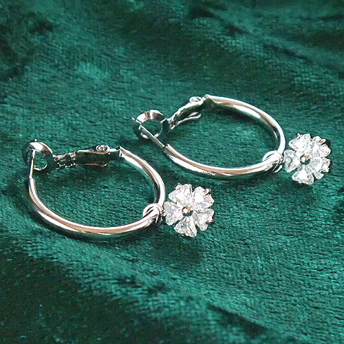 ピアス フラワーチャーム付き キュービックジルコニア レディース 両耳用 1ペア販売 真鍮 ロジウム プラチナ仕上げ ジルコニア トライアングルカット クリア 太ワイヤーリング ストレートポスト バネ式キャッチ ぶら下がり 揺れる オールシーズン 【RCP】