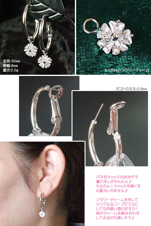 詳しくは⇒コチラから その他 商品のお取り扱いについて商品詳細 本体サイズ 全長:30.0mm フラワー:縦8.0mm×横8.0mm×厚み:3.0mm フープ:外円直径:21.0mm / 重さ:2.0g(片側) ポストサイズ 軸長:9.0mm×軸径:0.8mm(ふつう) 素材 真鍮(本ロジウム鍍金) キュービックジルコニア(人工石) 配送方法 ・宅配便(クロネコ宅急便):○ ・追跡可能メール便(ネコポス便):○ その他 商品のお取り扱いについて