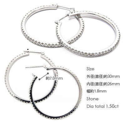 ◆商品詳細 材 質 プラチナ900(品質を保証するpt900の刻印) ルース 天然ダイヤモンド 計1.50ct 大きさ 直径(外径)約30.0mm直径(内径)約26.0mm幅約1.8mmポスト約0.8mm×約1.0mm 備 考 材質・石目(ダイヤ)の刻印入り ◆大量生産ではないため、ご注文からお届けまで約2週間ほど頂いております。