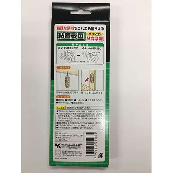 ●サイズ(約)・70×250×45mm(吊りヒモ含む)●成分・粘着液:ポリブデン●用途・ハエとり ハエ捕り●キーワード・ハエ 害虫 駆除●品名・粘着プロ ハエとり ハウス型 3枚入●品番・2187●JAN・4956810221875●メーカー名・(株) 小久保工業所●カテゴリ・L120016●管理単位・10個/240個●入数・3枚