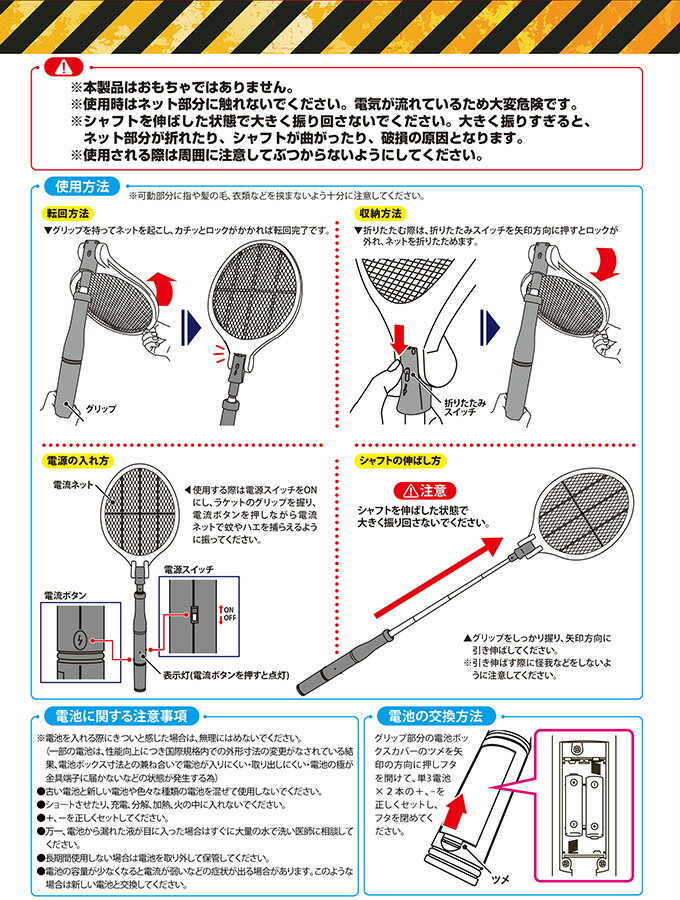 ◆シャフトを伸ばせば最長106.5cmに!高いところや離れた場所にも! ◆ラケットのネット部分に蚊やハエがあたると電撃で退治! ◆使わないときはたたんでコンパクトに収納できます。