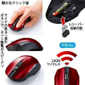 【仕様】●メーカー:サンワサプライ●型番:MAWBL33R●商品名:静音ワイヤレスマウス●ワイヤレスタイプ●中型サイズ●カラー:レッド●読み取り方式:ブルーLEDセンサー方式●インターフェース:USB HID仕様バージョン1.1準拠※USB3.1/3.0/2.0インターフェースでもご使用になれます。