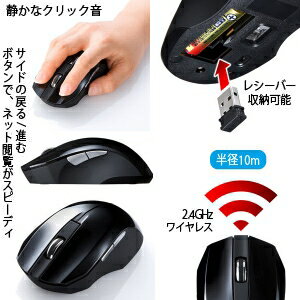 【仕様】●メーカー:サンワサプライ●型番:MAWBL33BK●商品名:静音ワイヤレスマウス●ワイヤレスタイプ●中型サイズ●カラー:ブラック●読み取り方式:ブルーLEDセンサー方式●インターフェース:USB HID仕様バージョン1.1準拠※USB3.1/3.0/2.0インターフェースでもご使用になれます。