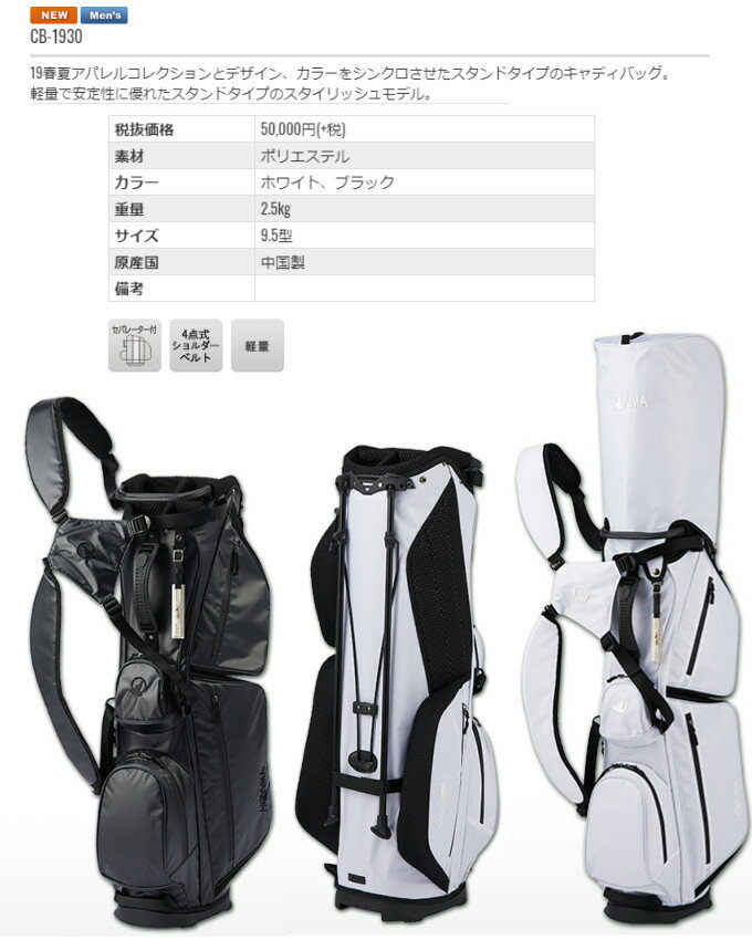 HONMA 2019年モデル 本間ゴルフ スタンドキャディバッグ CB-1930 ホンマ アパレルコレクションとデザイン、カラーをシンクロさせたスタンドタイプのキャディバッグ。